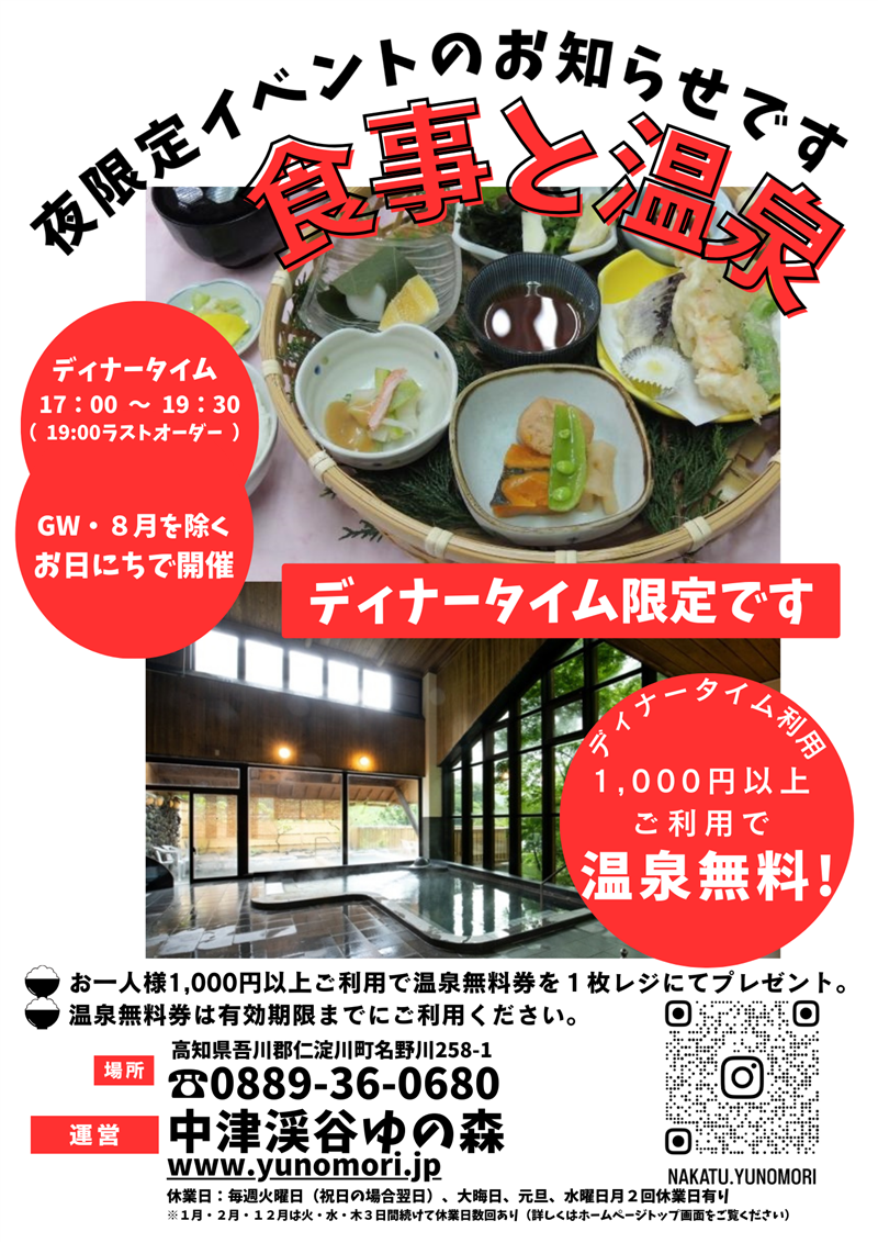 | ご利用時間 | < 日帰り温泉 > 11:00 ~ 20:30 (最終入浴19:30) |