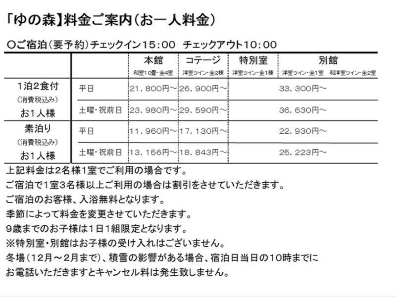 | お子様のご宿泊について (宿泊ご予約の前にご確認ください) お子様(13才未満)がいらっしゃる場合はご年齢と併せてお知らせ下さい。 9歳までのお子様が含まれる場合のご宿泊は2016年9月1日(木)より1日1組とさせていただいております。すでに別のご予約がある場合はご宿泊はご遠慮いただいております。ご理解、ご了承のほどよろしくお願いします。 |